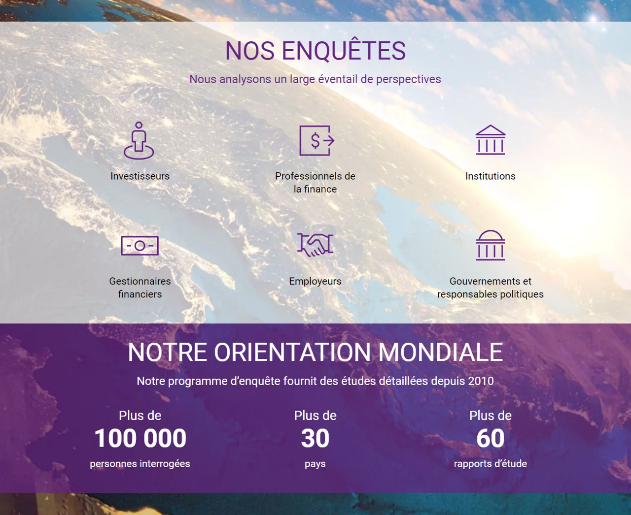 Fondé en 2010, le Natixis Center for Investor Insight est une initiative de recherche mondiale axée sur les problématiques essentielles qui façonnent le paysage de l’investissement d’aujourd'hui. Le Centre mène des enquêtes à l’échelle mondiale afin d’analyser le sentiment et le comportement des investisseurs, les perspectives du marché, ainsi que les perceptions des risques des investisseurs institutionnels, des professionnels de la finance et des particuliers du monde entier. Notre objectif est de faciliter l’identification des tendances, des enjeux et des opportunités et, en fin de compte, de favoriser des échanges constructifs avec nos clients.